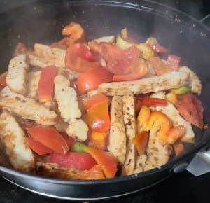 3. Added in sliced peppers and continue to pan fry everything stirring often.